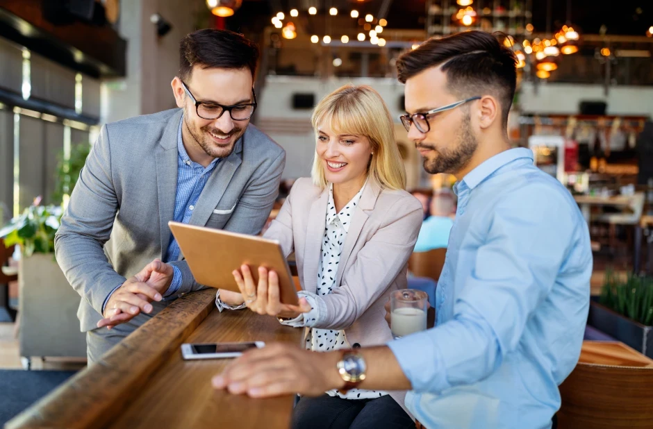 Colleagues discussing in coworking office